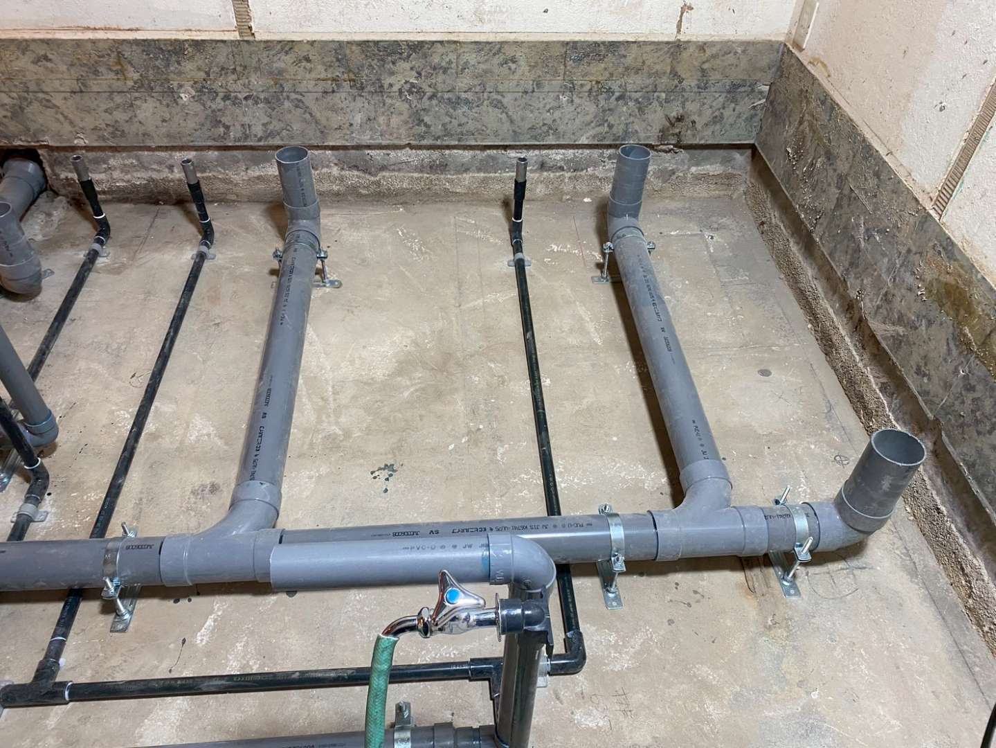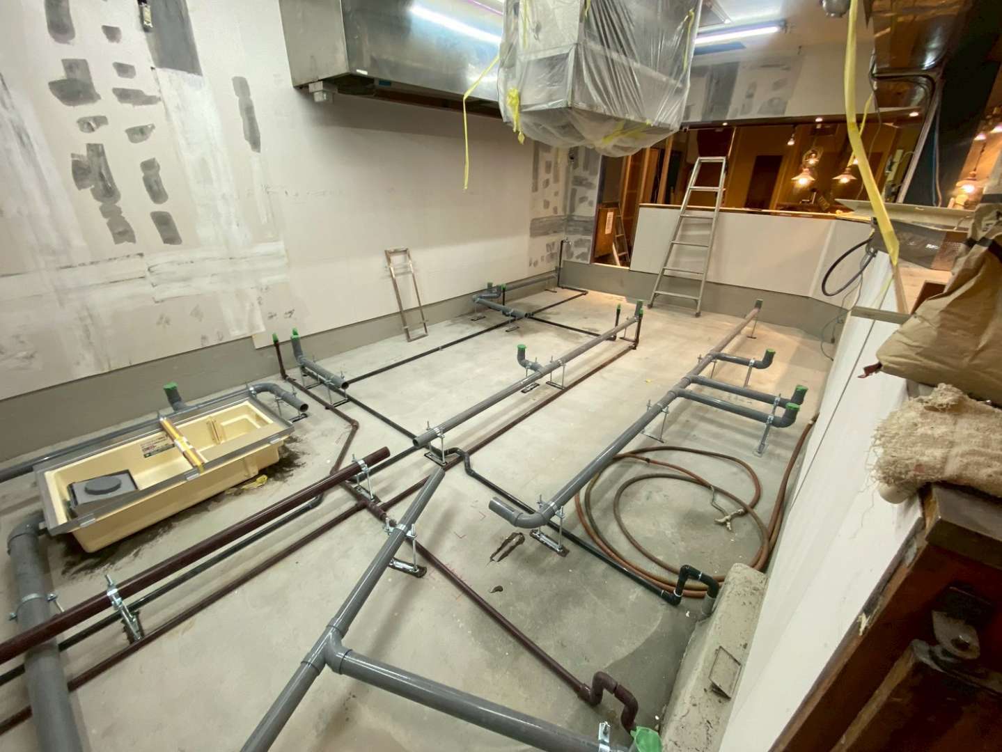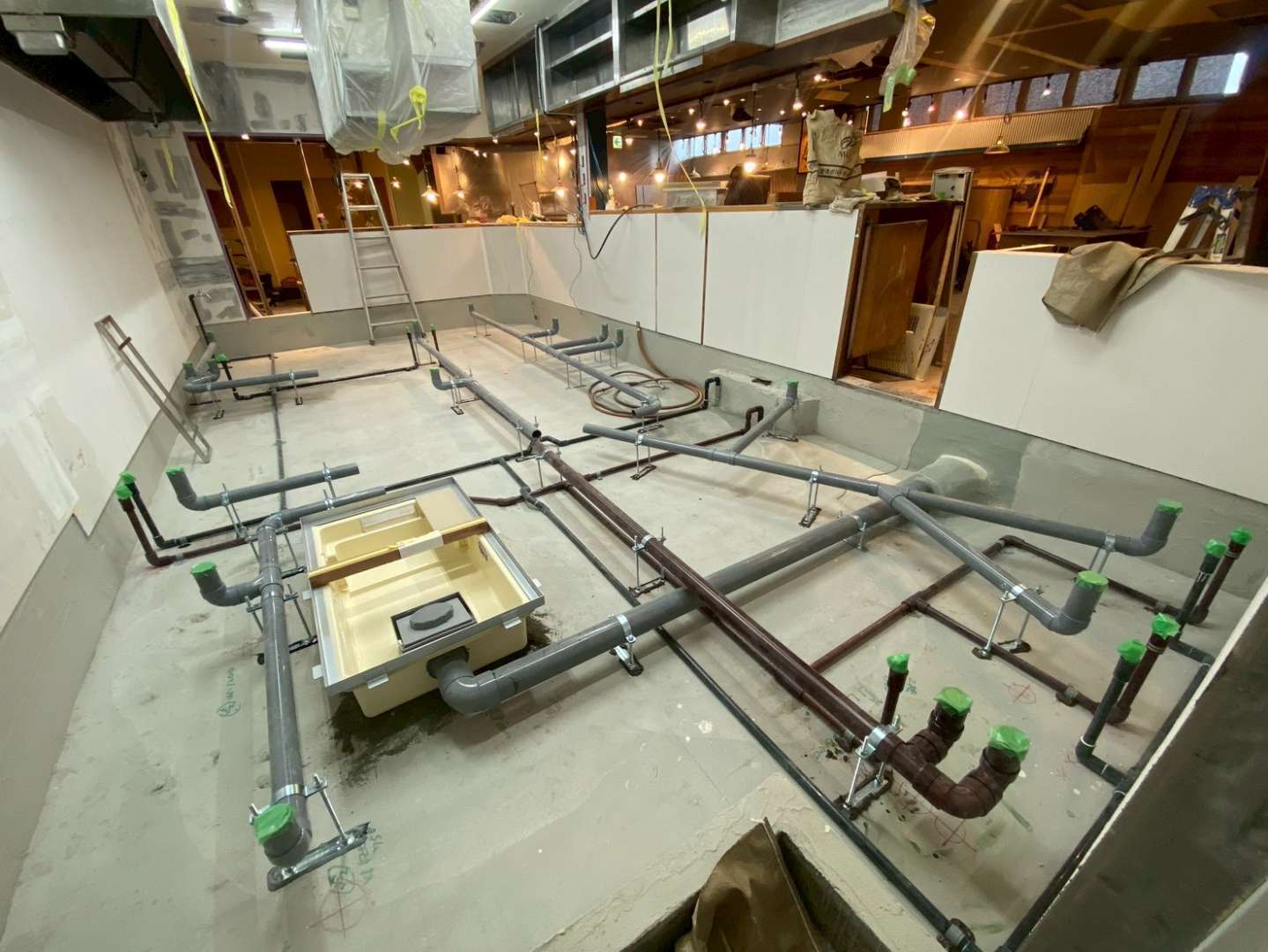 千葉県柏市にて、新規開業予定の飲食店の給排水設備工事を行いました。厨房設備の充実に加え、今後のレイアウト変更にも柔軟に対応できるよう、将来を見据えた配管設計を行っております。